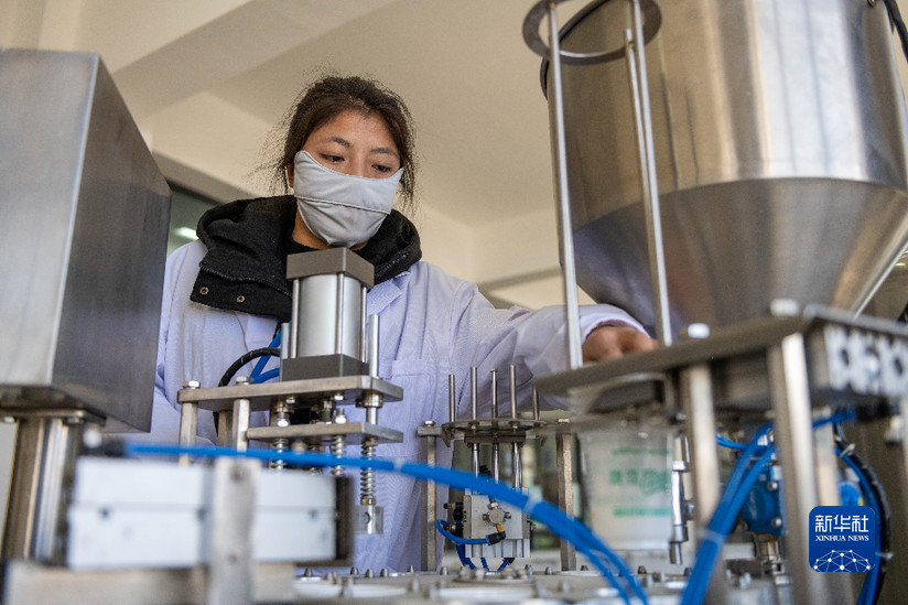 工作人員在西藏娘亞牦牛養殖產業發展有限責任公司的酸奶生產車間作業(3月30日攝)。新華社記者 周荻瀟 攝