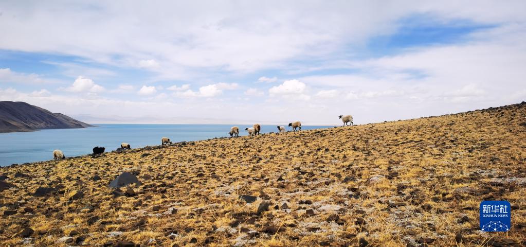在位于西藏自治區那曲市的巴木錯,羊群在湖邊吃草(2022年4月13日攝,手機照片)。新華社記者 沈虹冰 攝