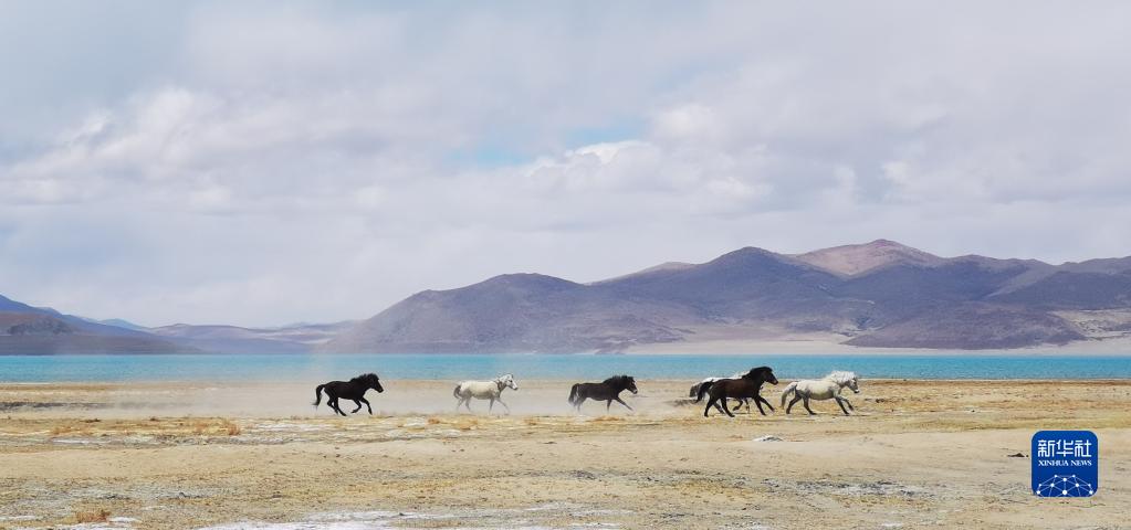 馬群在位于西藏自治區日喀則市聶拉木縣境內的佩枯錯旁奔跑(2021年5月14日攝,手機照片)。新華社記者 沈虹冰 攝