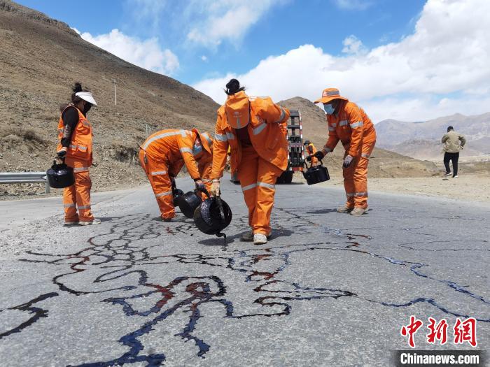 圖為在基層農村公路,女護路員正熟練地開展瀝青灌縫作業。西藏自治區交通運輸廳供圖