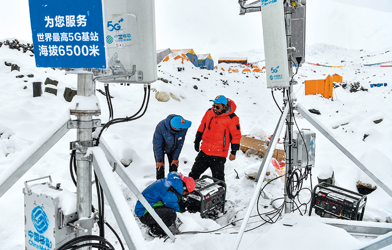 在海拔 6500 米的珠峰前進(jìn)營(yíng)地,中國(guó)移動(dòng)工作人員在調(diào)試 5G 基站(2020 年 5 月 21 日攝) 晉美多吉 攝