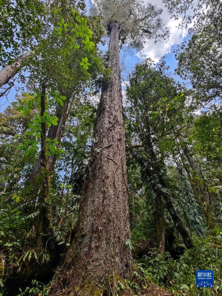 這是科研人員在西藏自治區(qū)墨脫縣背崩鄉(xiāng)格林村記錄到的高達(dá)76.8米的不丹松。(采訪對(duì)象供圖)
