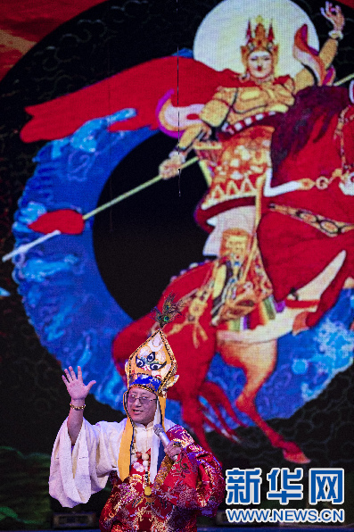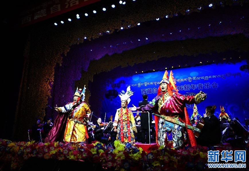 2015年12月30日晚,在拉薩舉行的西藏自治區2016年《吉祥彩虹》新年音樂會上,演員表演格薩爾說唱。新華社記者 晉美多吉攝