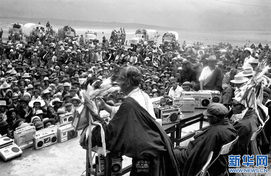 西藏那曲縣78歲的民間藝人阿達向觀眾說唱《格薩爾王傳》。新華社記者 馬競秋 攝(1986年1月15日發)