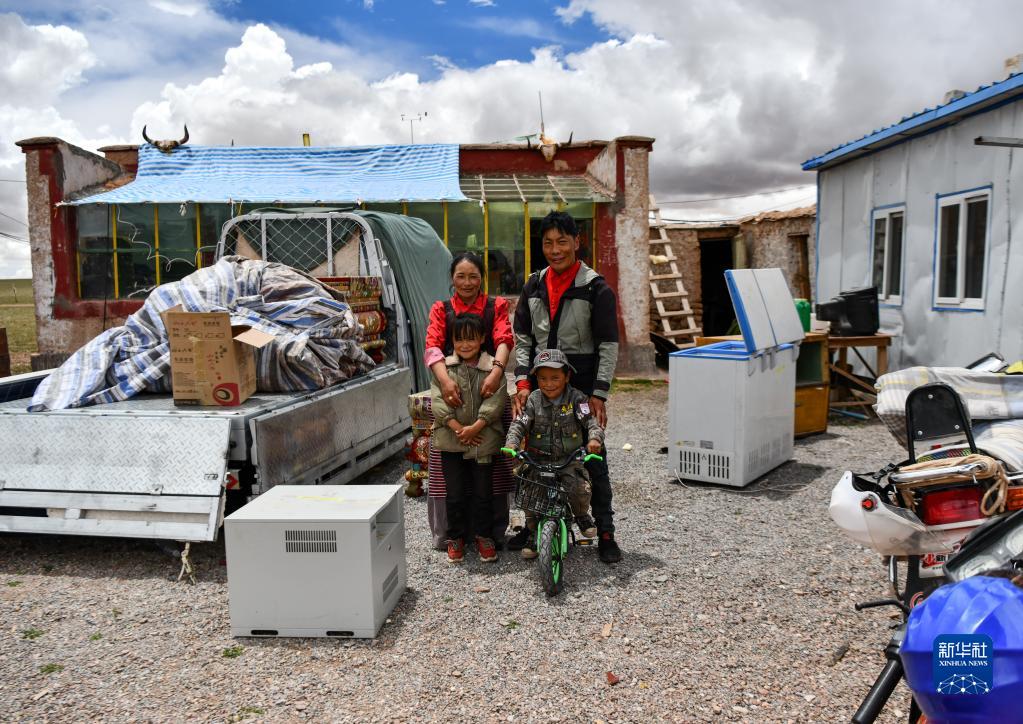 雙湖縣多瑪鄉果根擦曲村牧民貢布旺青和家人在等待運送家具的車輛(7月12日攝)。新華社記者 晉美多吉 攝
