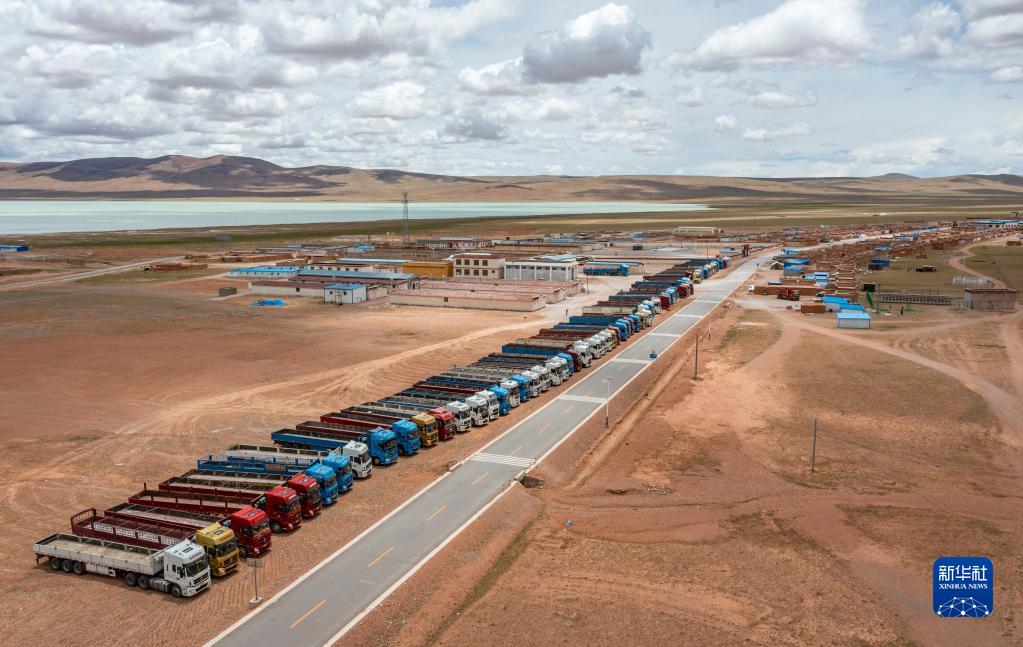 在雙湖縣多瑪鄉(xiāng)拍攝的負(fù)責(zé)運送搬遷群眾家具的貨車(7月12日攝,無人機(jī)照片)。新華社記者 孫非 攝