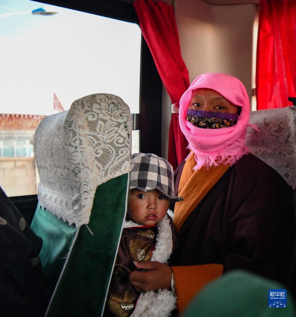雙湖縣多瑪鄉(xiāng)果根擦曲村牧民次仁央金(右)乘坐大巴,準(zhǔn)備前往森布日安置點(7月19日攝)。新華社記者 晉美多吉 攝