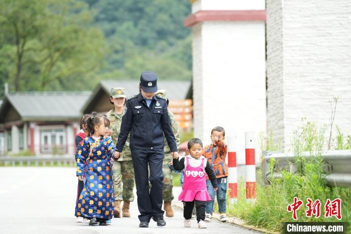 圖為戍邊民警與駐地部隊官兵攜龐達村雙語幼兒園小朋友行走在村里。李錦輝 攝