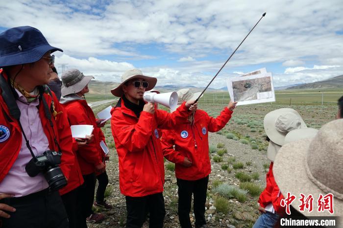 科考隊員、中國科學院青藏高原研究所張帥博士在古湖底分析講解瑪不錯和嘎拉錯劇變之謎。中新社記者 孫自法 攝