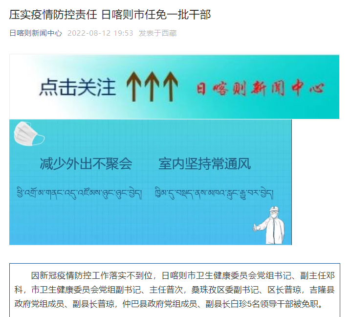 據日喀則新聞中心微信公眾號消息,因新冠疫情防控工作落實不到位,日喀則市衛生健康委員會黨組書記、副主任鄧科,市衛生健康委員會黨組副書記、主任普次,桑珠孜區委副書記、區長普瓊,吉隆縣政府黨組成員、副縣長普瓊,仲巴縣政府黨組成員、副縣長白珍5名領導干部被免職。