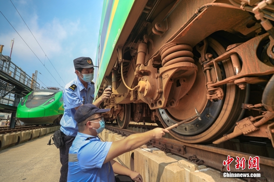8月17日,北京車輛段北京西庫檢車間內,檢修人員對時速160公里動力集中型復興號動車組(俗稱“綠巨人”)的走行部進行檢修。這里是京津冀地區唯一的“綠巨人”檢修維修基地,肩負著18列共計261節車輛的檢修任務。隨著暑運逐漸迎來返校返程高峰,檢修人員也在加班加點為列車做好體檢工作,確保運行安全。 中新社記者 賈天勇 攝