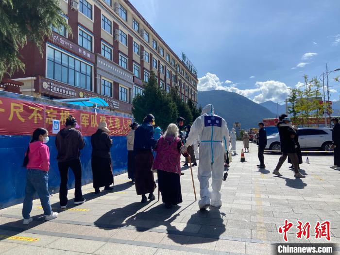 圖為林芝邊境管理支隊輪訓隊民警孫震正攙扶行動不便的老人前往核酸檢測點。任遠波 攝