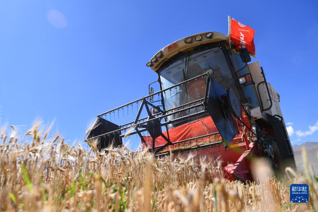 西藏日喀則市江孜縣熱索鄉努康村農機合作社的村民集中對村里三千多畝耕地進行機械化收割(9月19日攝)。新華社記者 晉美多吉 攝