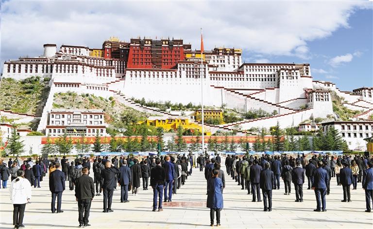 10月1日上午,西藏自治區慶祝中華人民共和國成立73周年“升國旗、唱國歌”儀式在拉薩布達拉宮廣場舉行。圖為儀式現場。記者 李洲 攝