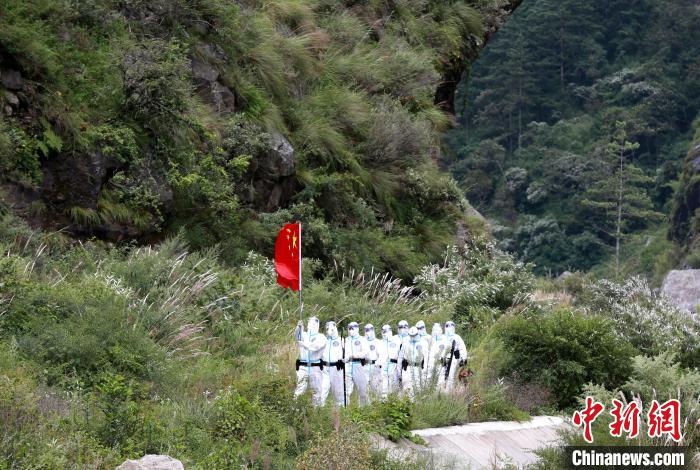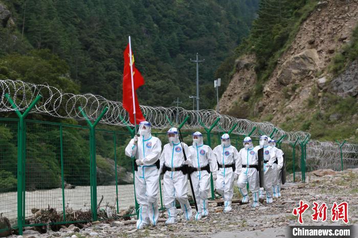 10月1日,駐扎在中尼邊境的吉隆出入境邊防檢查站組織移民管理警察高舉國旗在邊境執勤巡邏任務。