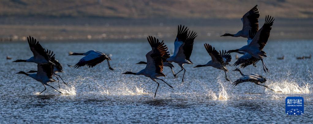 在林周縣虎頭山水庫(kù)拍攝的黑頸鶴(11月6日攝)。新華社記者 姜帆 攝