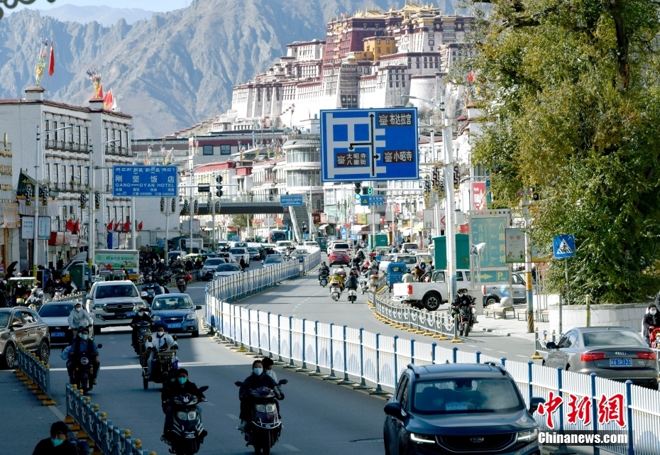 11月17日,拉薩市北京東路車流人流漸多。近日,在拉薩八廓街道、吉日街道、吉崩崗街道等主城區及市區主要路段,車流量、人流量逐步恢復。隨著拉薩市新冠肺炎疫情防控形勢持續向好,各行各業有序復工復產,民眾生活逐步正常,街頭巷尾的“煙火氣”漸濃。 中新社記者 李林 攝