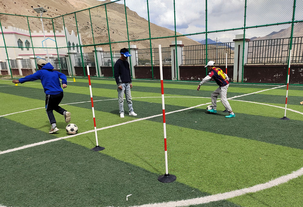 在西藏日喀則市定日縣扎西宗鄉完全小學的球場上,足球興趣小組的教練普次(中)在指導學生帶球繞桿(4月21日攝)。新華社發(白瑪 攝)