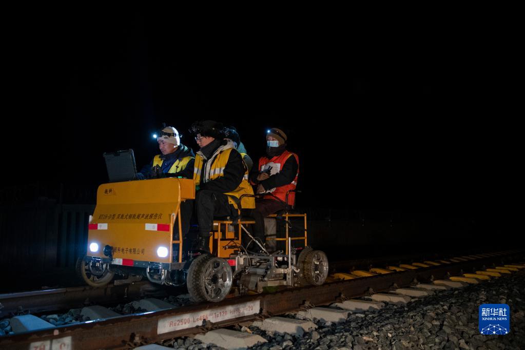 羅布(左)和同事在進行鋼軌探傷作業(yè)(1月12日攝)。新華社記者 孫非 攝