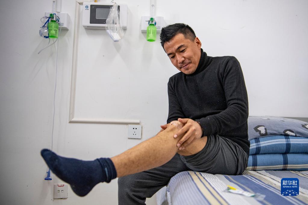 在拉林鐵路扎囊工電綜合工區(qū)的宿舍里,羅布給膝蓋貼膏藥。常年徒步進行鋼軌探傷,羅布落下了膝關(guān)節(jié)半月板損傷的病癥(1月12日攝)。新華社記者 孫非 攝