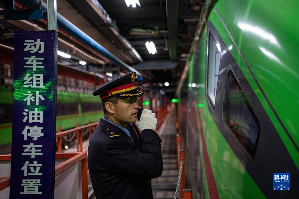 在拉薩機輛整備中心,黃起崗在和一體化調度中心確認動車組補油位置(1月11日攝)。新華社記者 孫非 攝