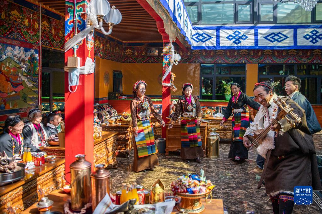 在藏歷農家年的家庭聚會中,人們彈奏扎念琴(1月23日攝)。新華社記者 孫非 攝