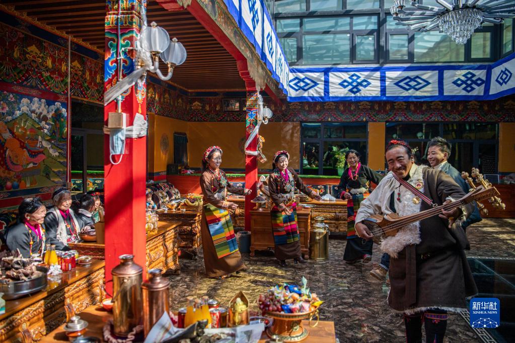 次旦老人的兒孫們在一邊彈扎念琴一邊跳舞(1月22日攝)。新華社記者 孫非 攝