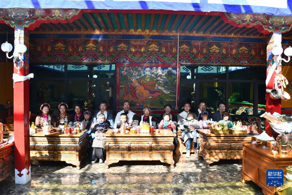 在位于西藏日喀則拉孜縣扎西宗鄉雜村的家中,次旦老人一臉幸福的微笑,家中小輩正輪流上前和她行碰頭禮。