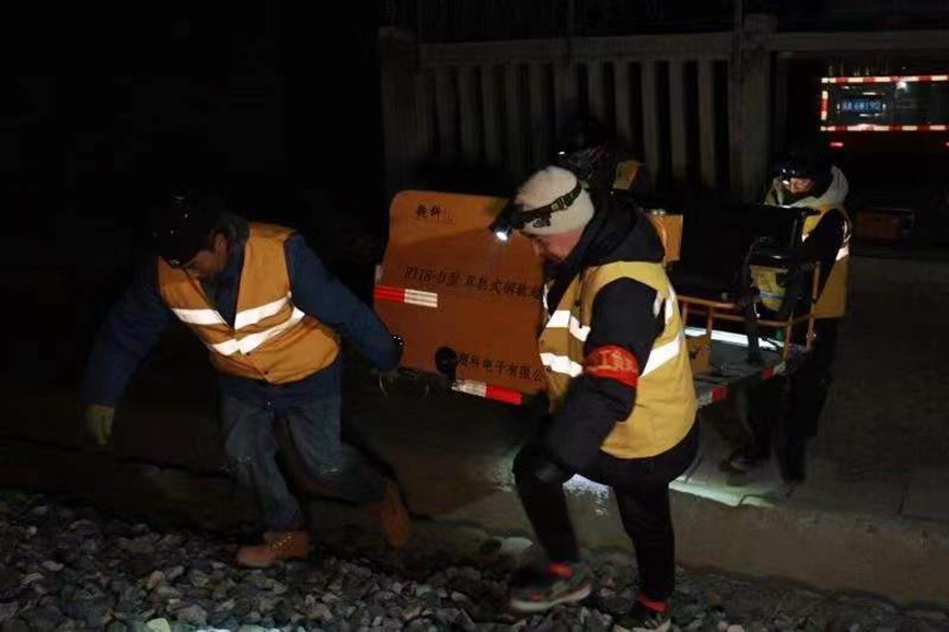 “大家?guī)Ш霉ぞ卟牧希瑴蕚涑霭l(fā)。”22時整,隨著作業(yè)負責人探傷工區(qū)工長羅布一聲令下,呼嘯的寒風中,黃色的“迷你敞篷車”緩緩啟動,載著4名職工,開始了當晚對拉林鐵路20多公里線路的探傷檢查任務(wù)。