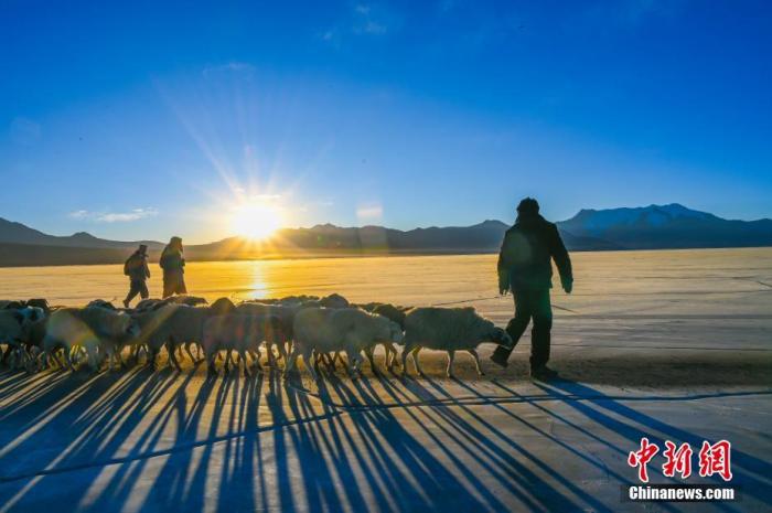 這個邊境小村3日迎來了一年一度的“趕羊”盛事。村民們將1400余只羊由岸邊通過厚實的冰面趕往湖心島牧場。普姆雍措被稱為“仙女之淚”,位于西藏山南市浪卡子縣,每到冬季極寒時,便是羊群轉牧場的好時機。