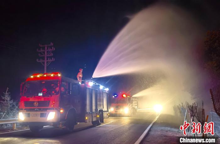 圖為森林消防員正在進行灑水增濕作業?!×种ナ猩窒拦﹫D