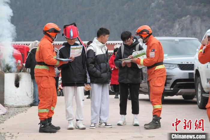 圖為森林消防員在景區重點區域普及防火知識?!×种ナ猩窒拦﹫D