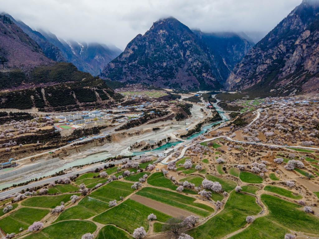 在西藏那曲市嘉黎縣尼屋鄉拍攝的桃花(無人機照片,2022年3月21日攝)。新華社記者周荻瀟 攝