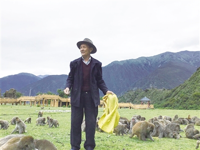 在多布杰看來,猴群也是一個小社會,母子情深、朋友互助、爭斗打架都有。在上千只猴子中,多布杰只給一只臉特別紅的小猴子取了個名字——“瑪惹”,漢語意思是“小紅”。因為出生后猴媽媽沒有奶水,它餓得嗷嗷直叫,多布杰只得將它帶回家中照料。那時,他的孫女也特別喜歡這只小猴子,每天放學回家就會給它喂吃的。幾天后,孫女翻遍了每個角落都沒有找到“瑪惹”,急得嚎啕大哭。多布杰耐心地說,我們和“瑪惹”是好朋友,帶它回來是為了讓它活下去,但它終歸是要回到猴群中,回到猴媽媽身邊。“瑪惹”長大后,也時常會找多布杰蹭衣撒嬌。