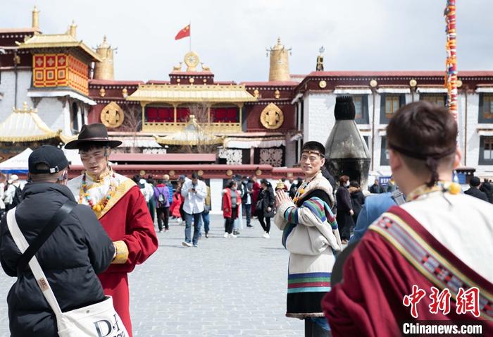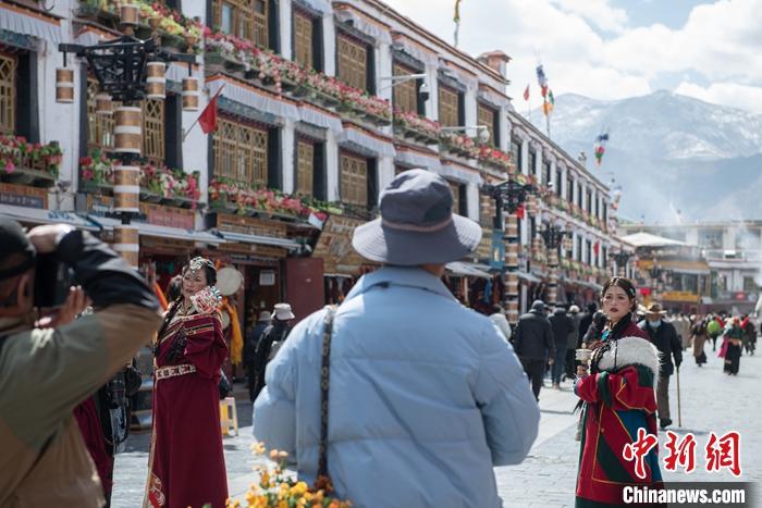 3月14日,游客穿上藏族傳統服飾在拉薩市八廓街拍照留念。 中新社記者 貢嘎來松 攝