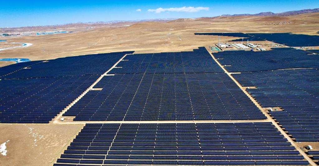 在海拔約4500米的那曲市色尼區甘丹康桑村,占地2200畝、25000多塊整齊排列的太陽能光伏組件在藍天白云的映襯下格外耀眼。