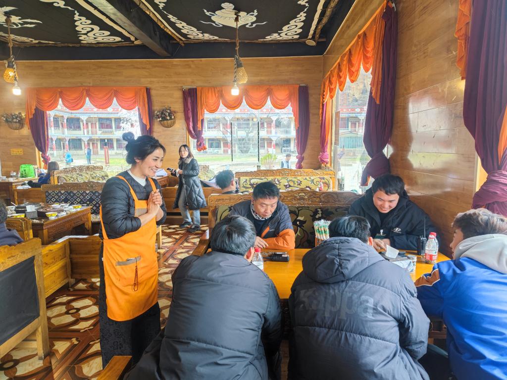 德吉旺姆(左一)正在農莊招待前來就餐的游客(3月26日攝)。新華社記者王澤昊 攝