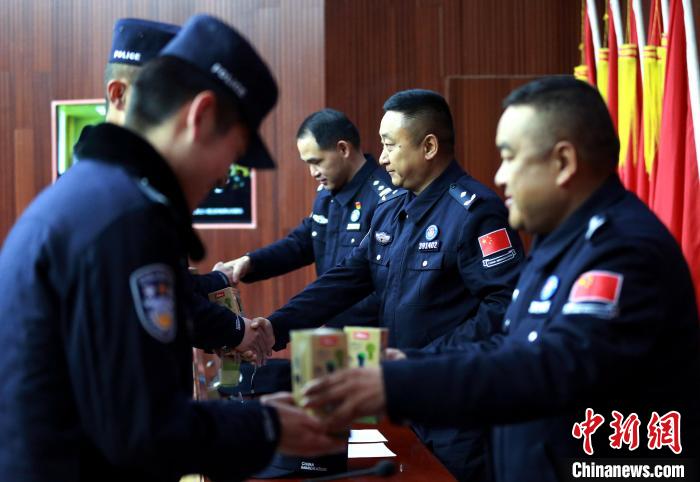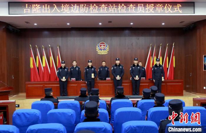 3月31日,邊檢站領(lǐng)導(dǎo)通過(guò)授章考核的移民管理警察授章。 肖富貴 攝