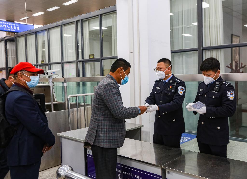 4月1日,移民管理警察在吉隆口岸驗放入境旅客。新華社發(肖富貴 攝)