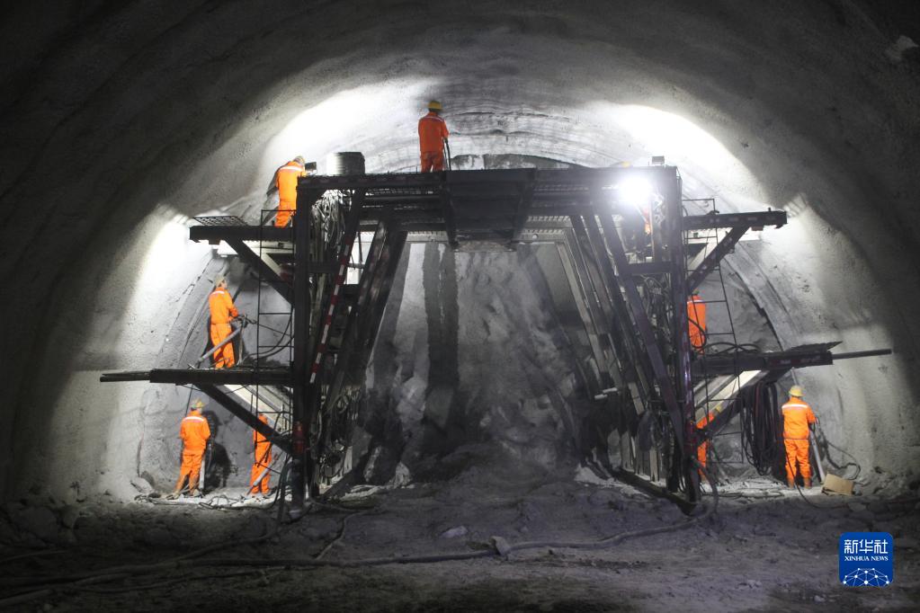 在拉薩至日喀則高速公路帕當山隧道,工人正進行掌子面打眼作業。(中鐵二十一局供圖)