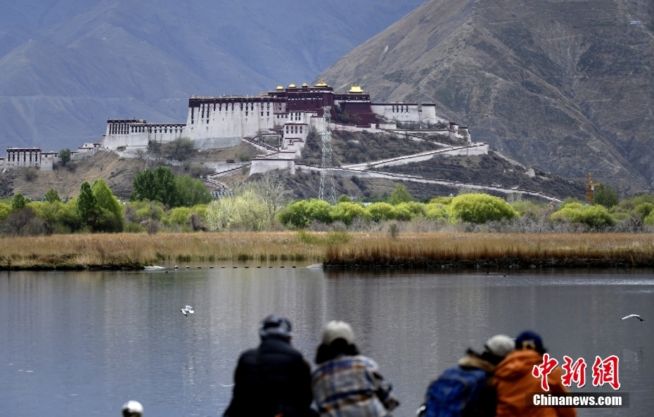 5月1日,市民游客在拉魯濕地欣賞布達拉宮。