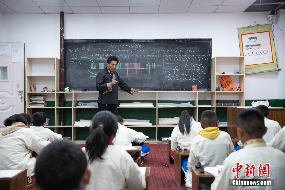 5月7日,西藏山南市,加查縣中學藏文書法興趣班的教師扎西達瓦給學生們上課。該興趣班由2名藏文教師任教,每周兩課時,利用自習課或晚自習時間為學生和教師授課。課程內容包含執筆、運筆、姿勢等基礎書寫技能,以及藏文中的烏金體、珠擦體、簇仁體、簇通體等各類字體的書寫方法。