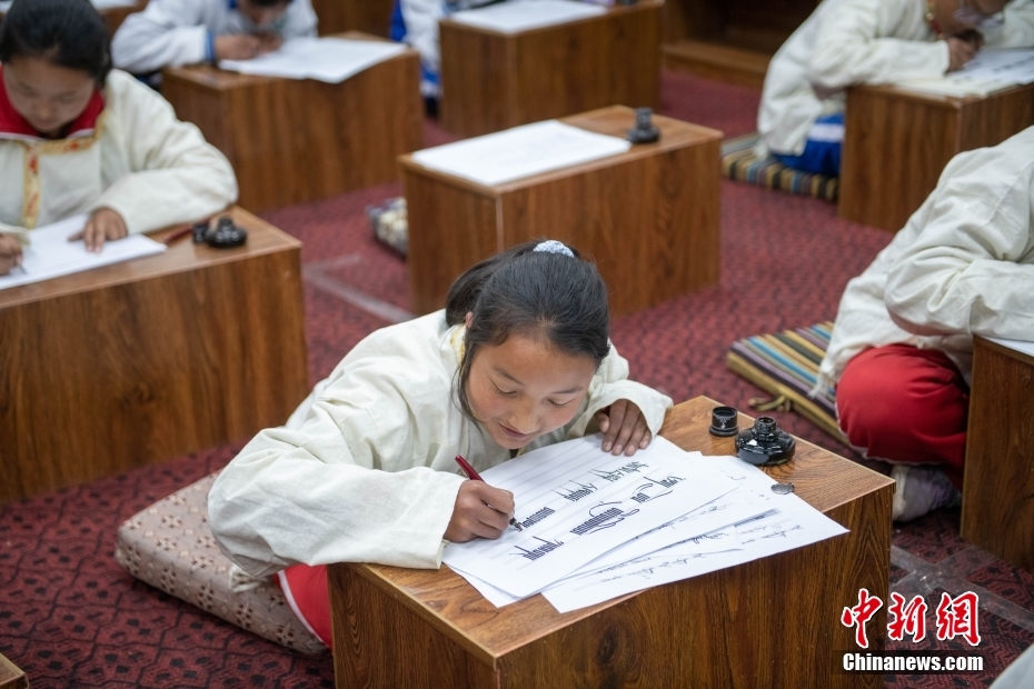 5月7日,西藏山南市,加查縣中學學生在上藏文書法興趣班。該興趣班由2名藏文教師任教,每周兩課時,利用自習課或晚自習時間為學生和教師授課。課程內容包含執筆、運筆、姿勢等基礎書寫技能,以及藏文中的烏金體、珠擦體、簇仁體、簇通體等各類字體的書寫方法。