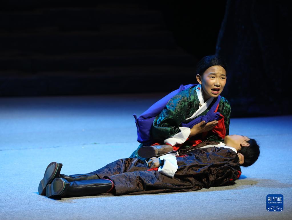 13歲的小演員旦增夢朗身著深綠色藏戲服飾,跪在舞臺中央,眼角噙淚,緊摟著失去意識的弟弟……低沉、哀慟的藏戲唱腔,舞臺兩側實時滾動的字幕,看哭了不少觀看試演的觀眾。