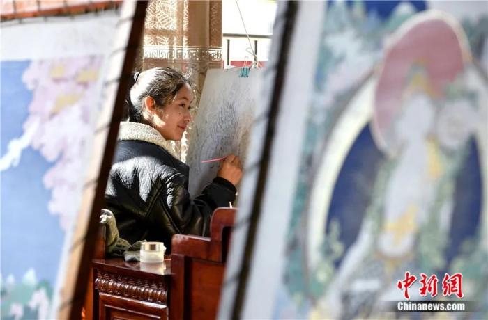 索朗次旺在西藏拉薩繪制唐卡。隨著社會的發展,越來越多的西藏女性學習唐卡繪畫。李林 攝