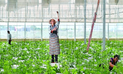 工作人員在山南市扎囊縣阿扎鄉的玻璃溫室里養護旗云瓜。湖南省第九批援藏工作隊引進智慧農業和戈壁田園植物工廠項目,在荒地建起有機果蔬基地200多畝。攝影:辜鵬博(湖南日報攝影記者)