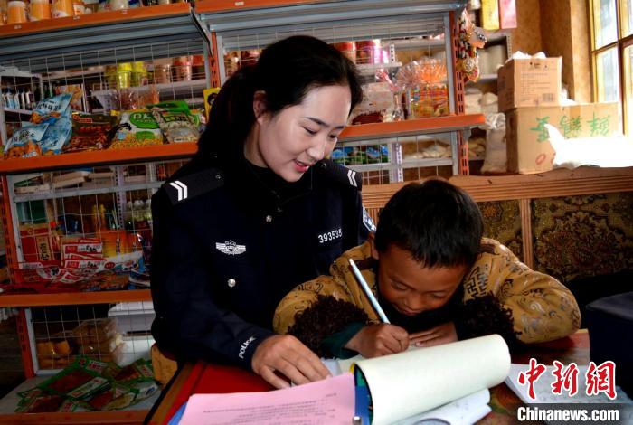 圖為索朗曲珍為轄區兒童輔導作業。勒布邊境派出所供圖
