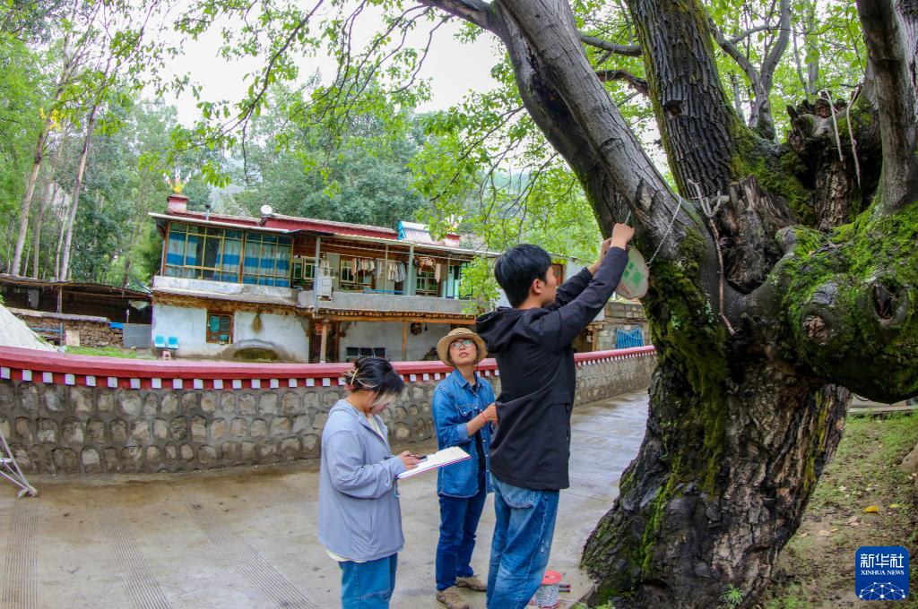 劉利平博士(中)在加查縣安繞鎮熱果村指導學生給一株古核桃樹掛牌(7月27日攝)。新華社記者 姜帆 攝