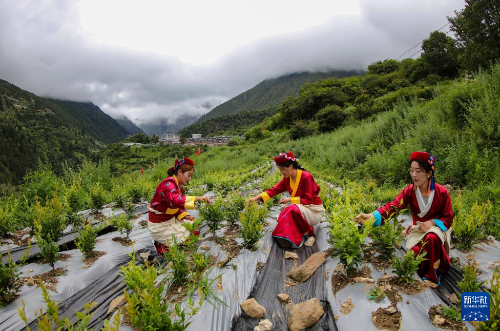 村民在采摘莓茶(7月28日攝)。新華社記者 旦增尼瑪曲珠 攝