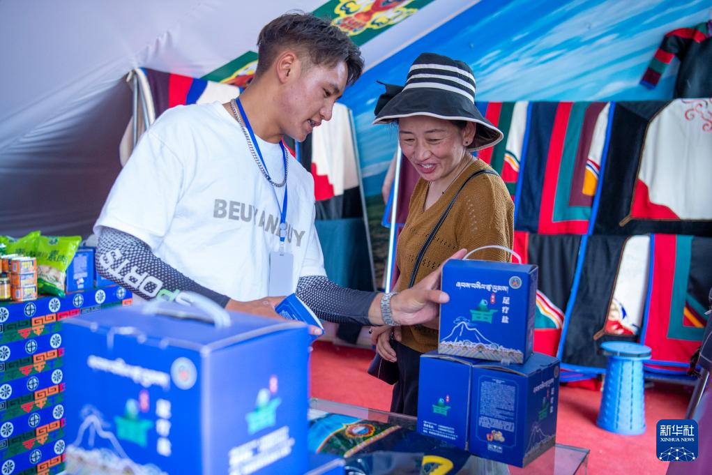 革吉縣鹽湖鄉羌麥村的村民旦真旺杰(左)在展銷會現場為顧客介紹產品(8月22日攝)。
